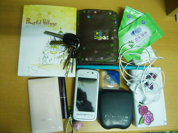 上面:笔记本、钥匙、钱包、湿巾跟纸巾